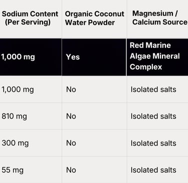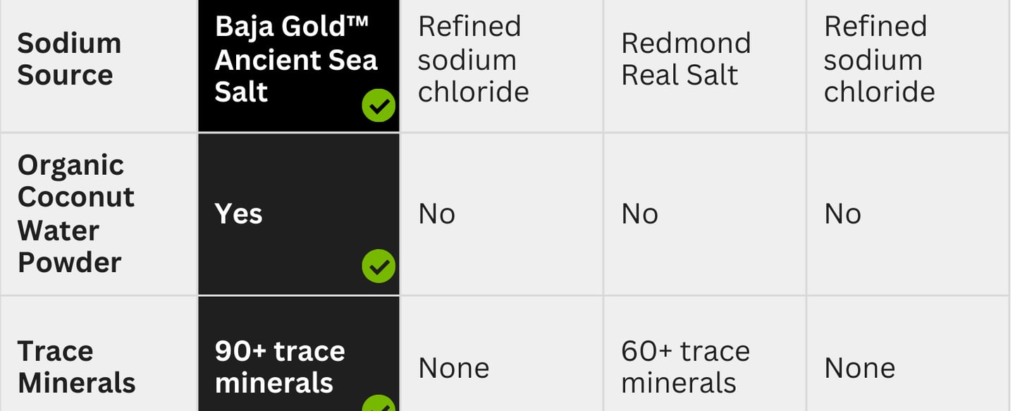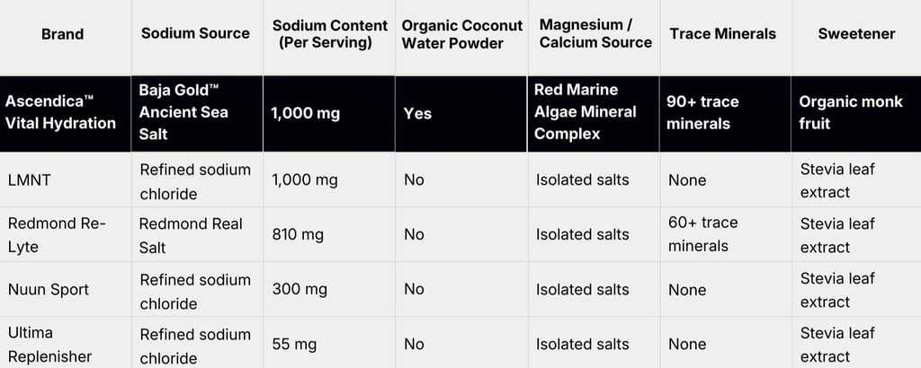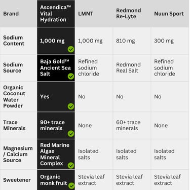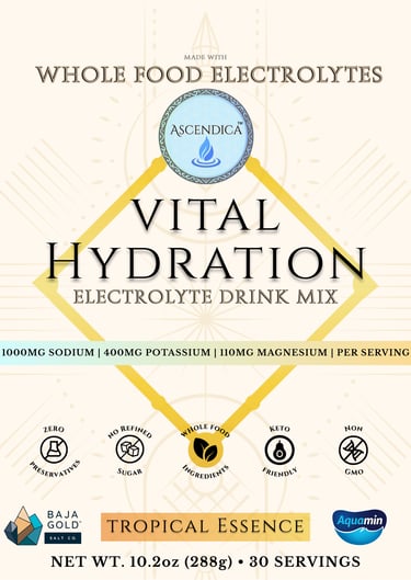 Ascendica™ uses a thoughtfully designed electrolyte formulation combining Baja Gold™ Ancient Sea Salt, red marine algae, and organic coconut water powder in science-informed ratios, providing a broad-spectrum electrolyte profile inspired by nutrient-dense whole foods.